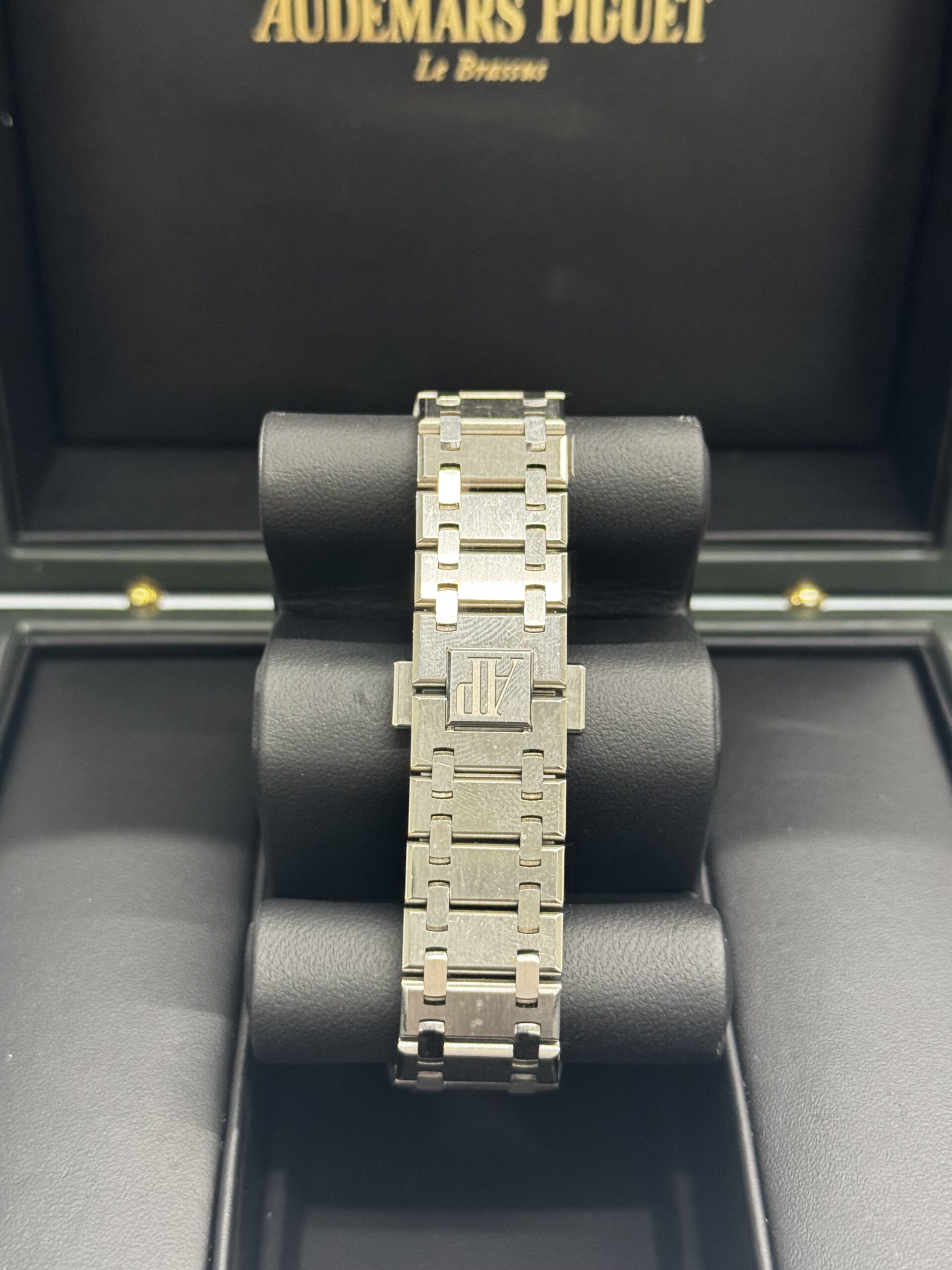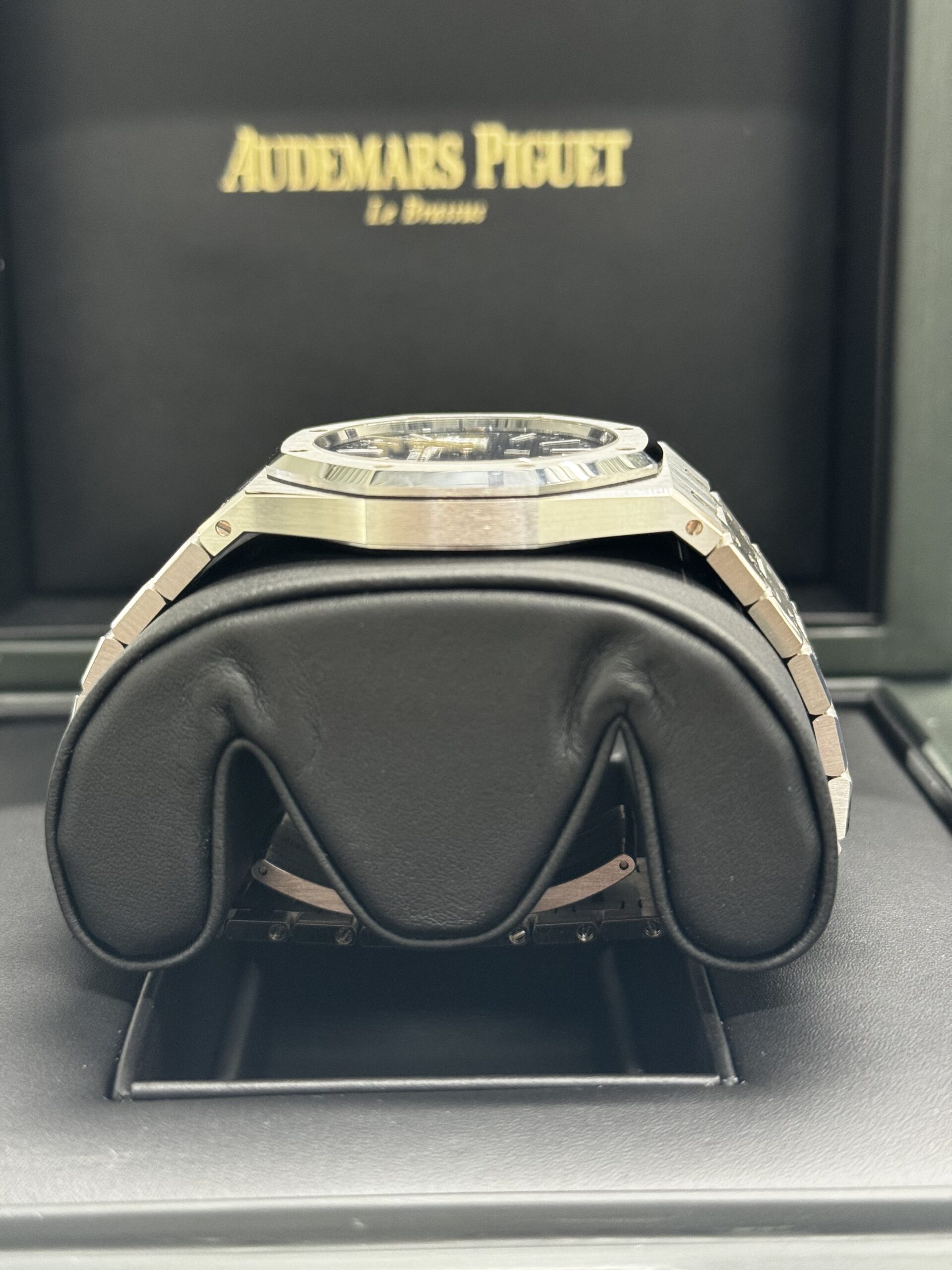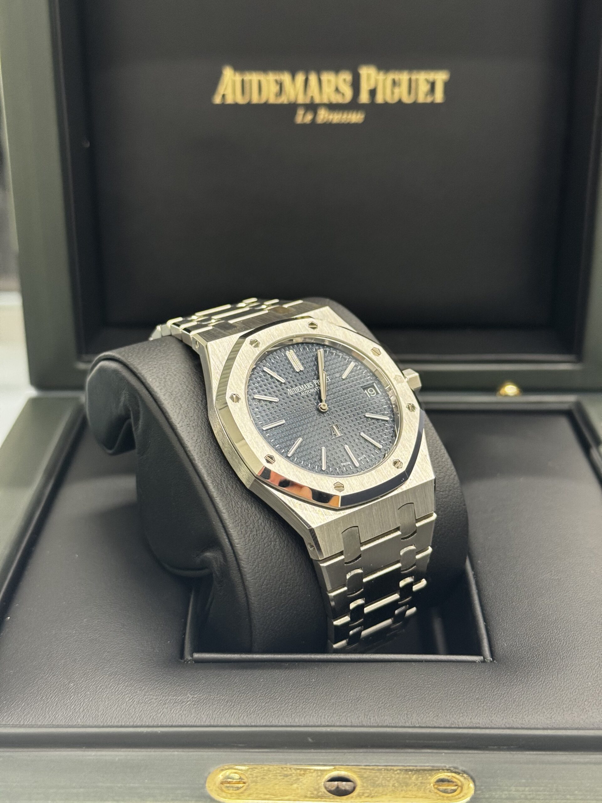 La Royal Oak “Jumbo” extra-thin Réf. 16202ST est l’héritière directe des modèles historiques “Jumbo”, revisitée pour le 50ᵉ anniversaire de la collection Royal Oak. Elle conserve les proportions iconiques de 39 mm et seulement 8,1 mm d’épaisseur, tout en intégrant un nouveau mouvement performant, le calibre 7121, avec date à réglage rapide. Elle offre une réserve de marche environ 55 heures et affiche une étanchéité modérée de 50 mètres. Son bracelet intégré en acier, ses finitions brossées/polies et son cadran “Petite Tapisserie” bleu Nuit Nuage 50 renforcent son statut d’icône moderne, à la fois fidèle aux codes de l’original et adaptée aux exigences contemporaines.