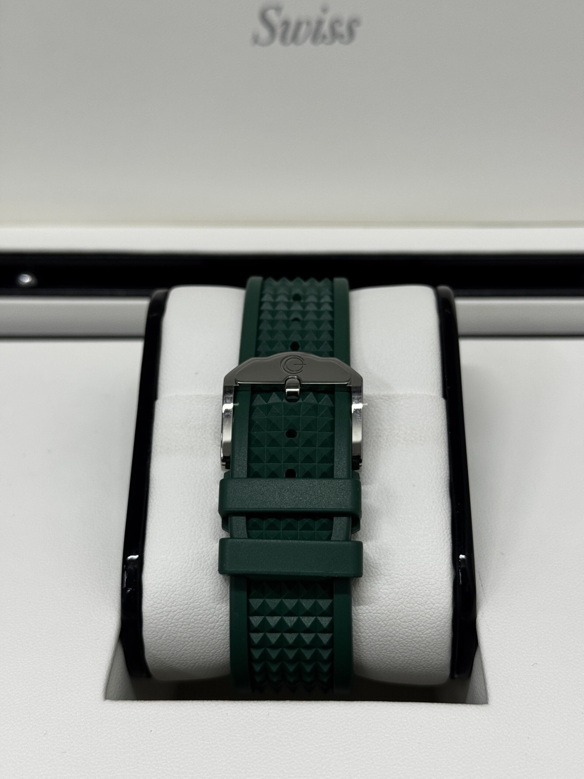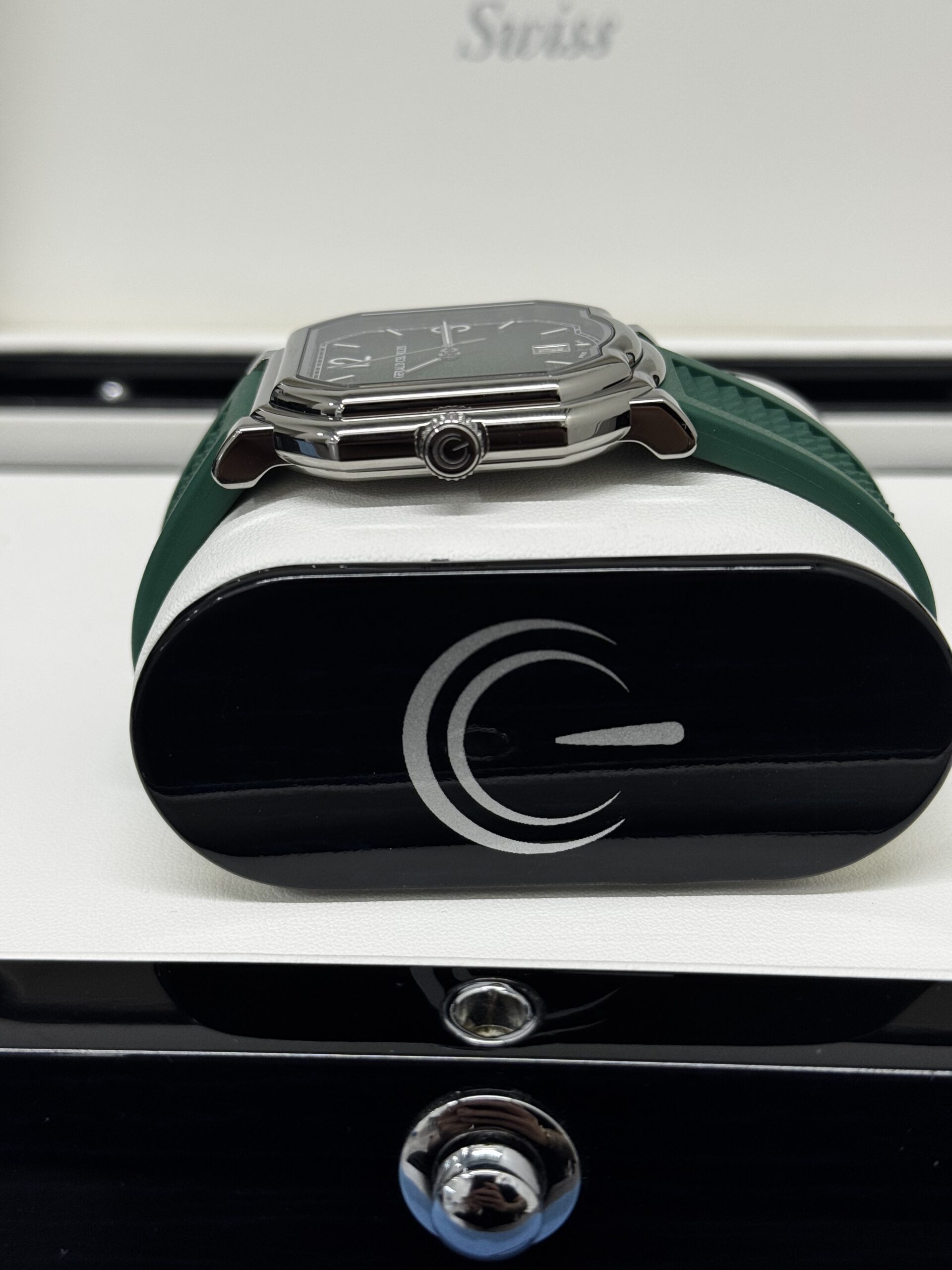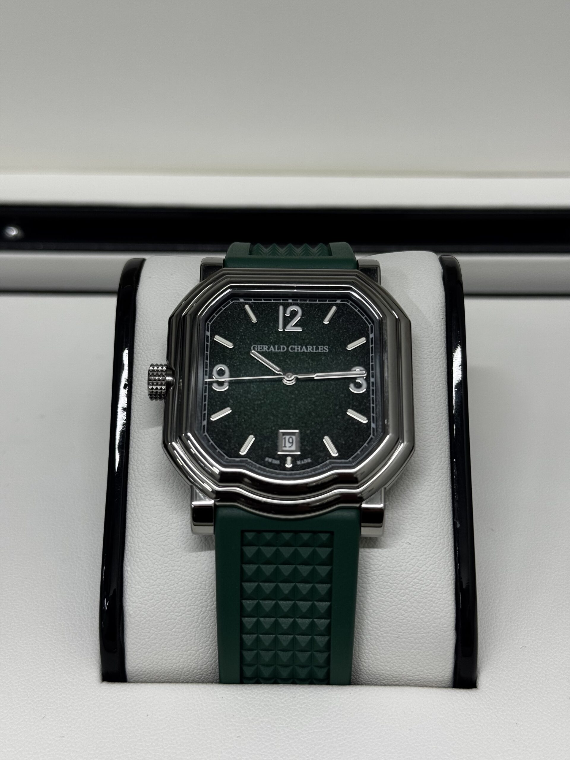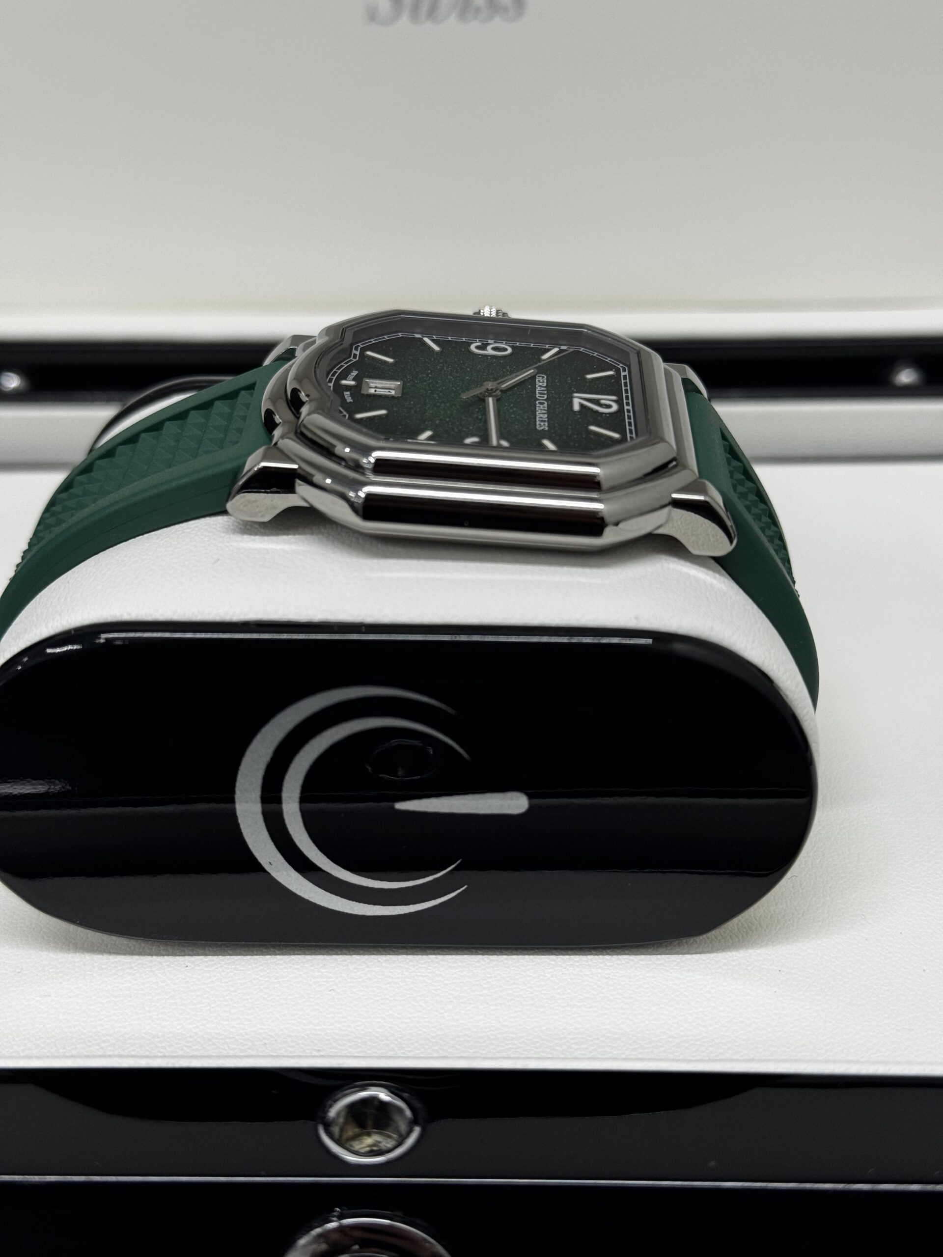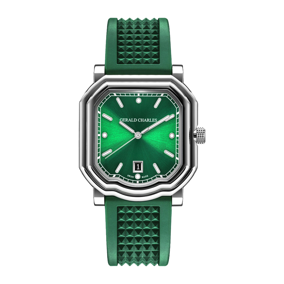 • Bracelet : Caoutchouc vert intégré au boîtier, motif signature Gerald Charles
