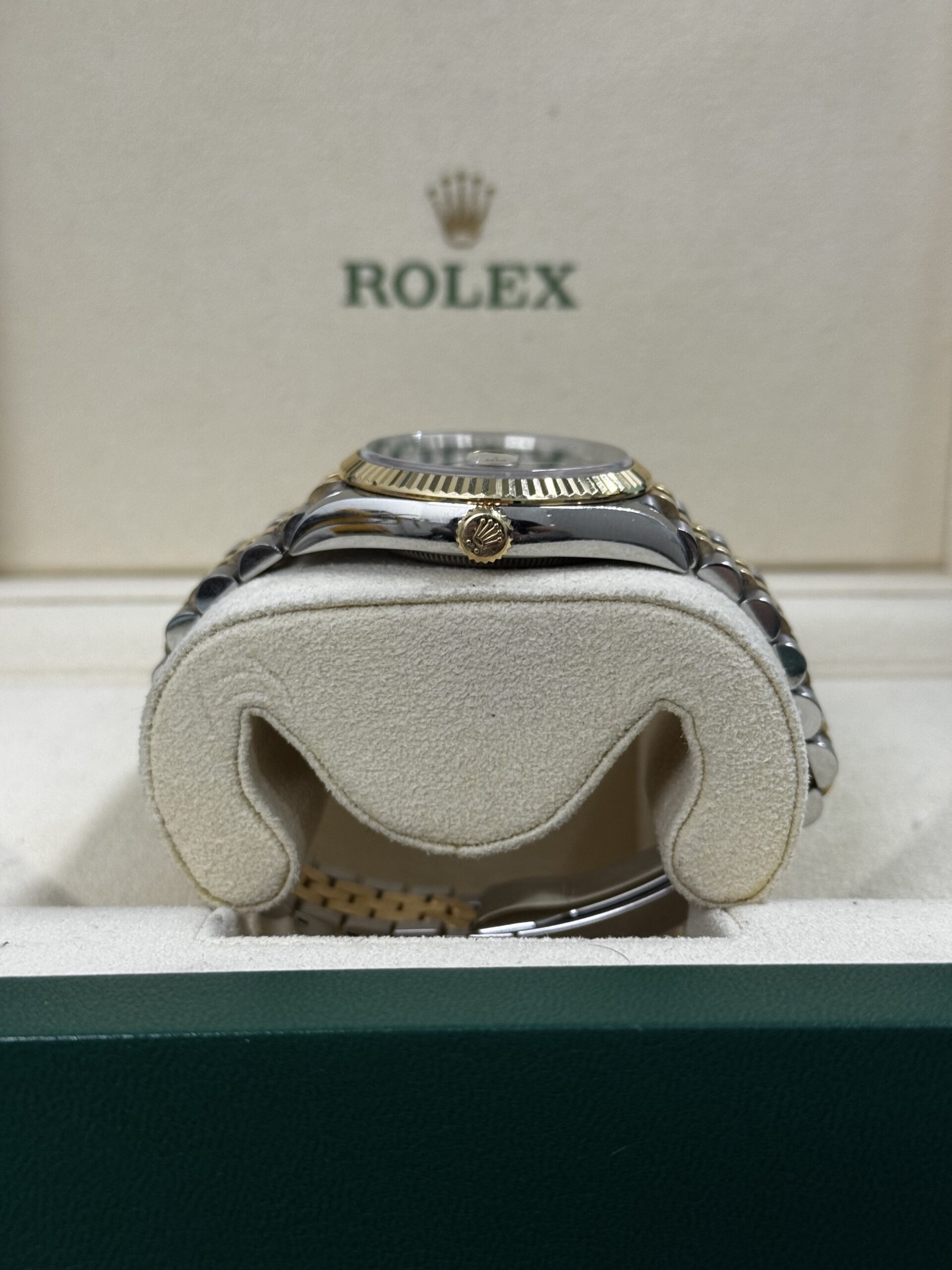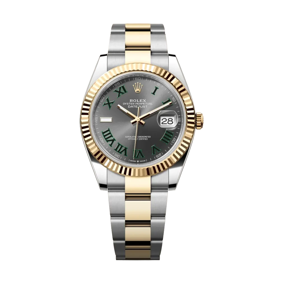 La Rolex Datejust 36 TT Wimbledon marie l’élégance intemporelle de la Datejust classique à l’esthétique moderne du cadran Wimbledon. Avec ses chiffres romains verts emblématiques sur cadran gris ardoise, ce modèle se distingue par un style raffiné et immédiatement reconnaissable. Conçue en Rolesor jaune — combinaison d’acier Oystersteel et d’or jaune 18 carats — la Datejust 36 TT Wimbledon offre un équilibre parfait entre sophistication, luminosité et performance horlogère.