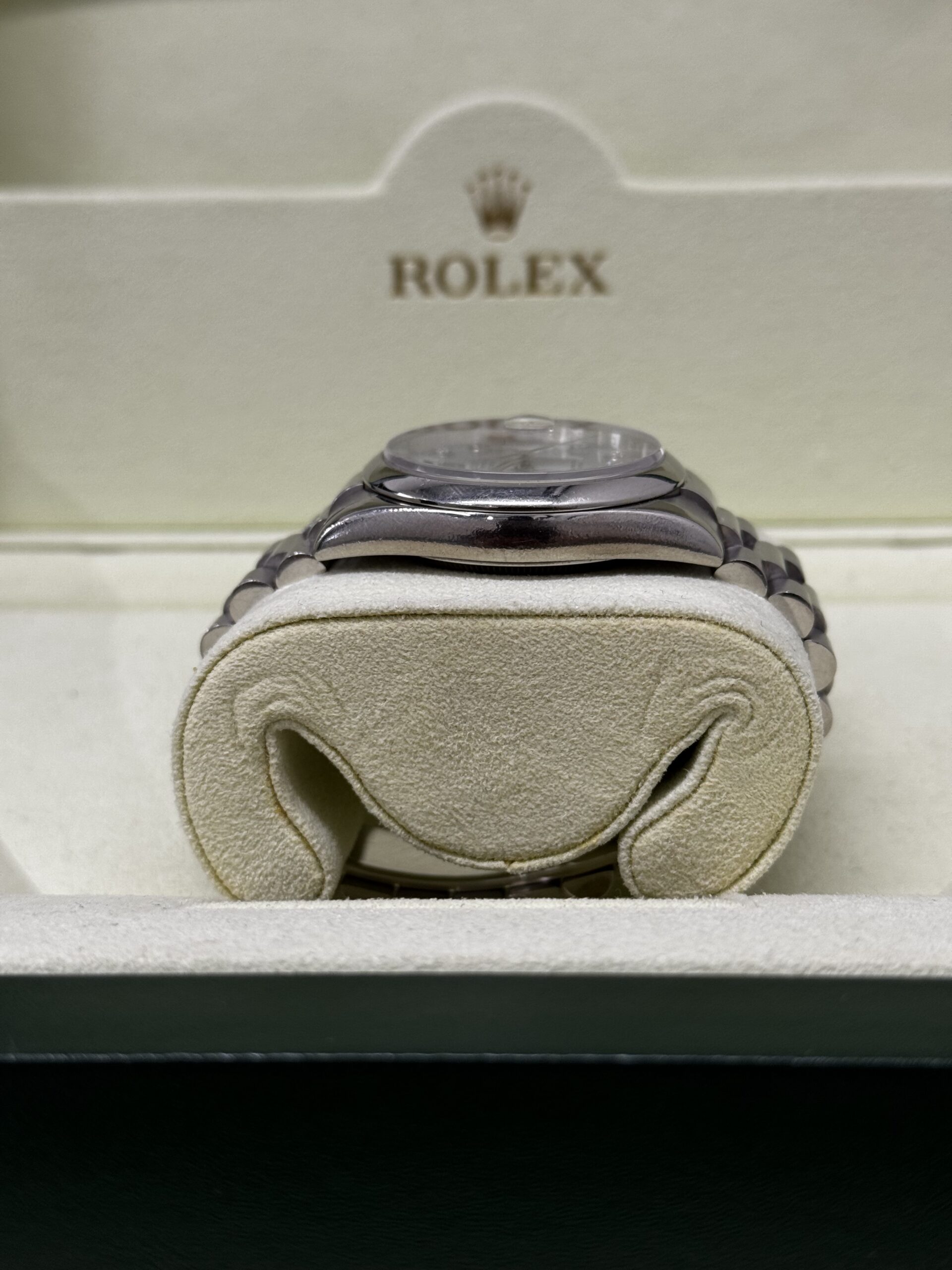Le Rolex Day-Date 36 en platine, avec mention « 6 vis », pourrait désigner une version de prestige à cadran spécifique et finitions sophistiquées. Dotée d’un boîtier de 36 mm en platine 950 massif, elle propose une apparence lumineuse, sobre et luxueuse. Son cadran — selon la configuration — peut être décoré ou sobre, et le modèle conserve les fonctionnalités emblématiques Day & Date à 12 h et 3 h. Animée par le calibre automatique 3255, cette montre offre précision, fiabilité et une réserve de marche confortable. Étanche à 100 mètres, elle incarne l’élégance ultime en format compact.