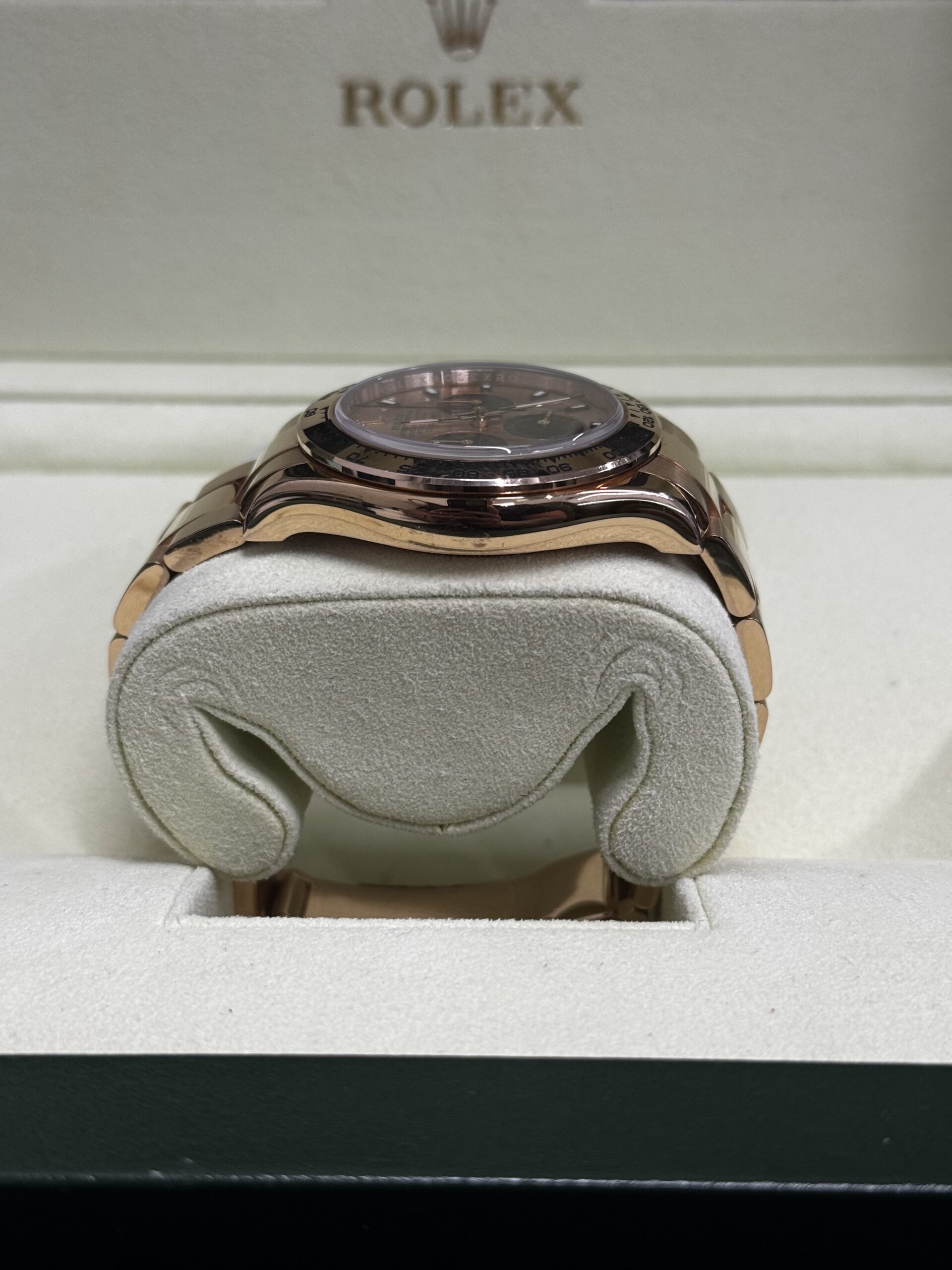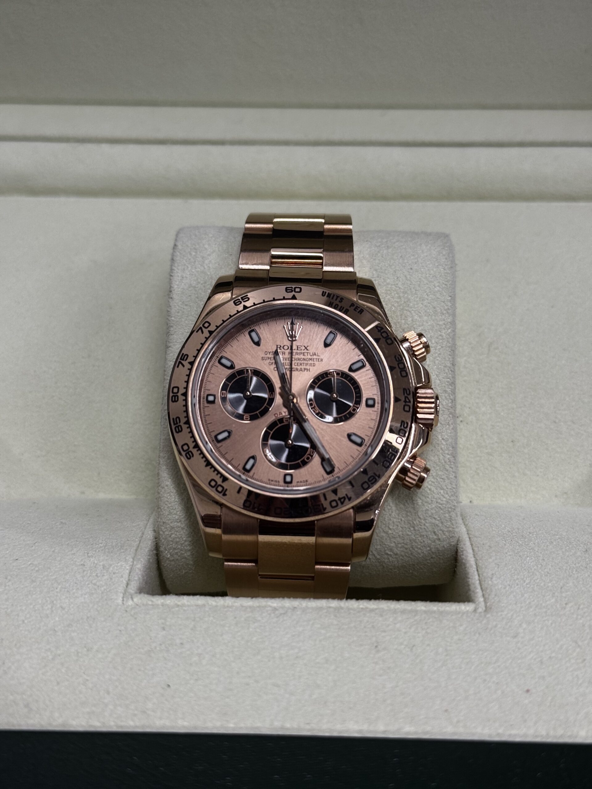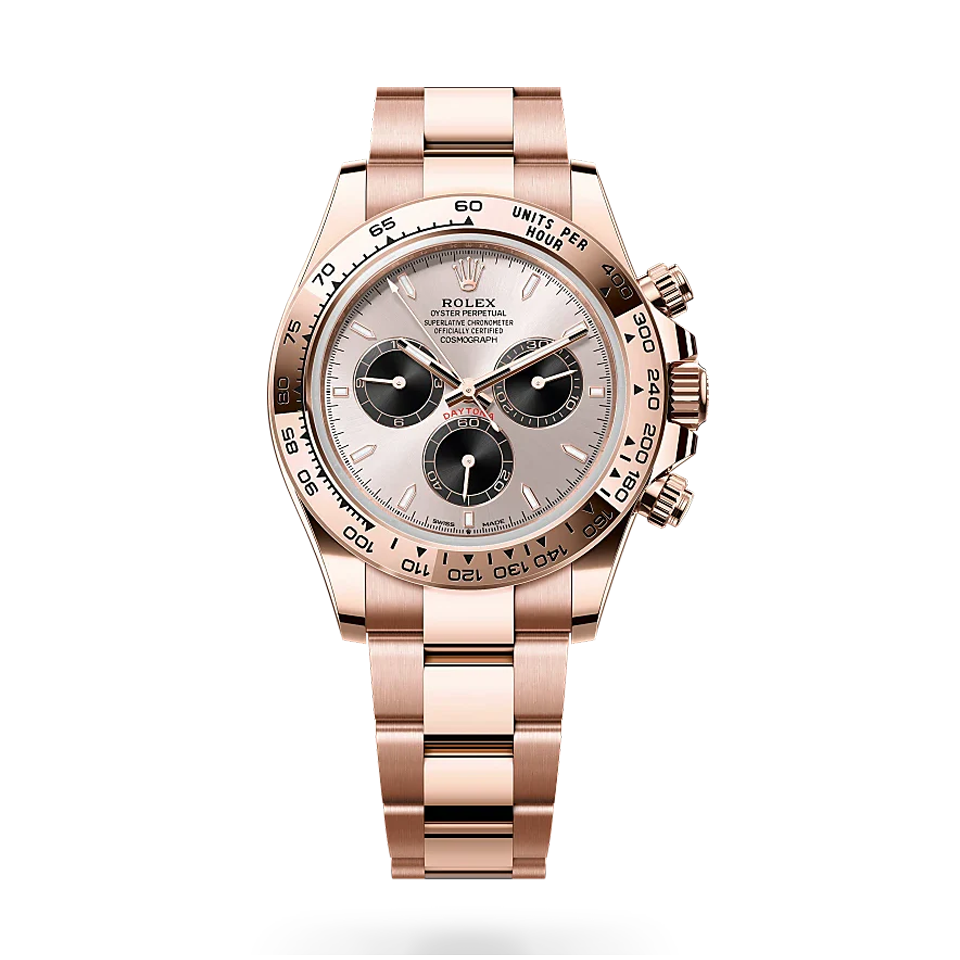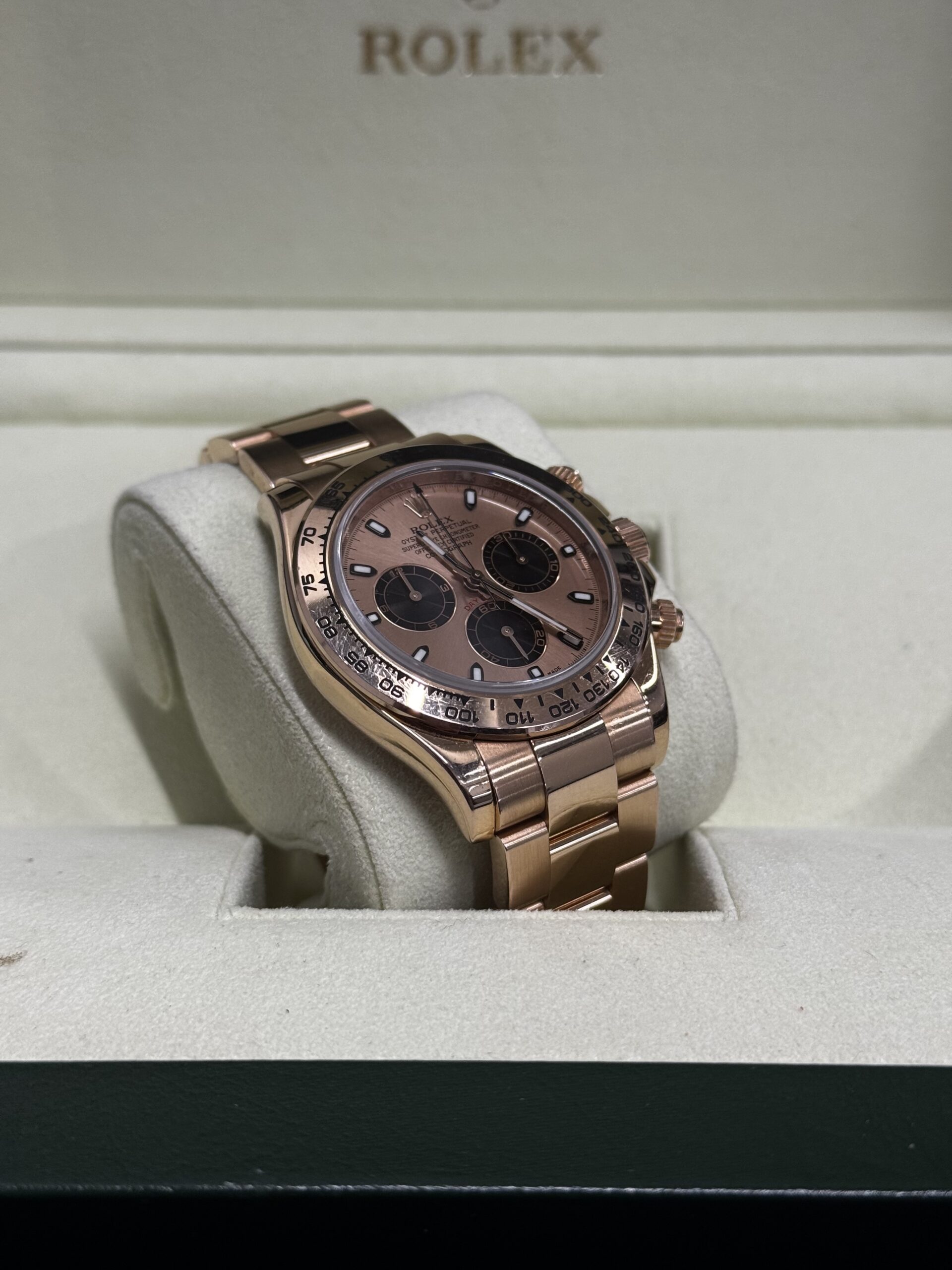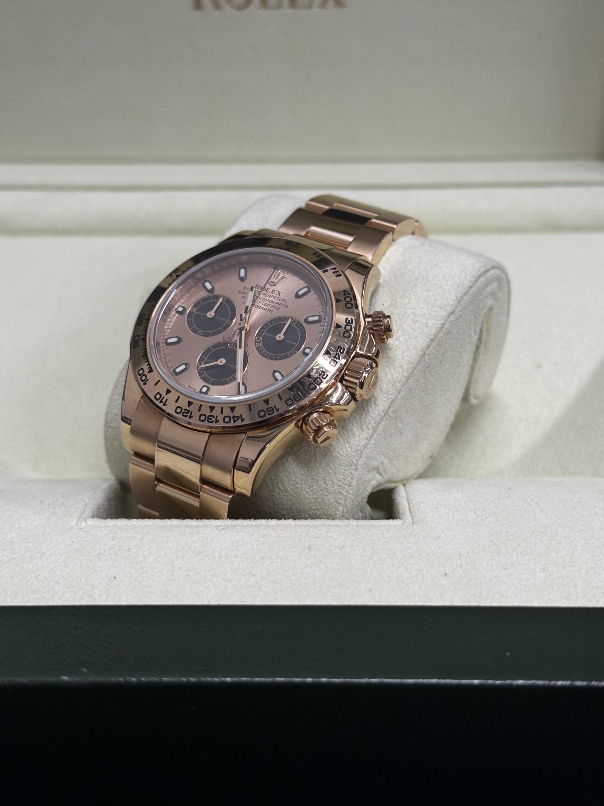 La Rolex Daytona en or rose avec cadran rose incarne une interprétation résolument luxueuse et contemporaine de la montre chronographe emblématique. Son boîtier Oyster de 40 mm en or rose 18 carats offre une présence puissante et raffinée au poignet, tandis que le cadran rose apporte une signature esthétique audacieuse et sophistiquée. Pensée pour la performance comme pour l’élégance, cette Daytona associe finitions haut de gamme, lisibilité optimale et mécanique de précision, faisant d’elle une pièce d’exception aussi désirable que polyvalente.
