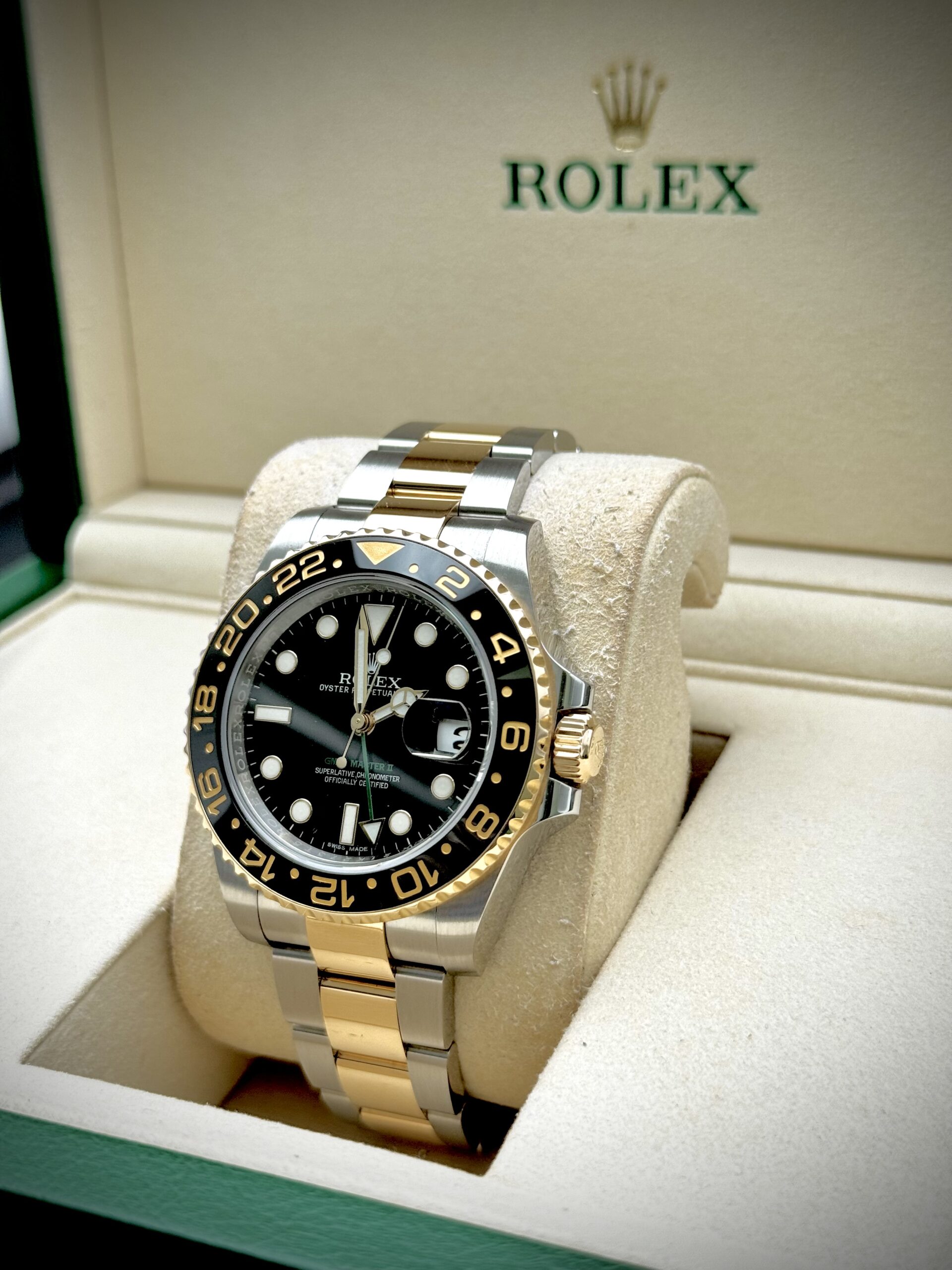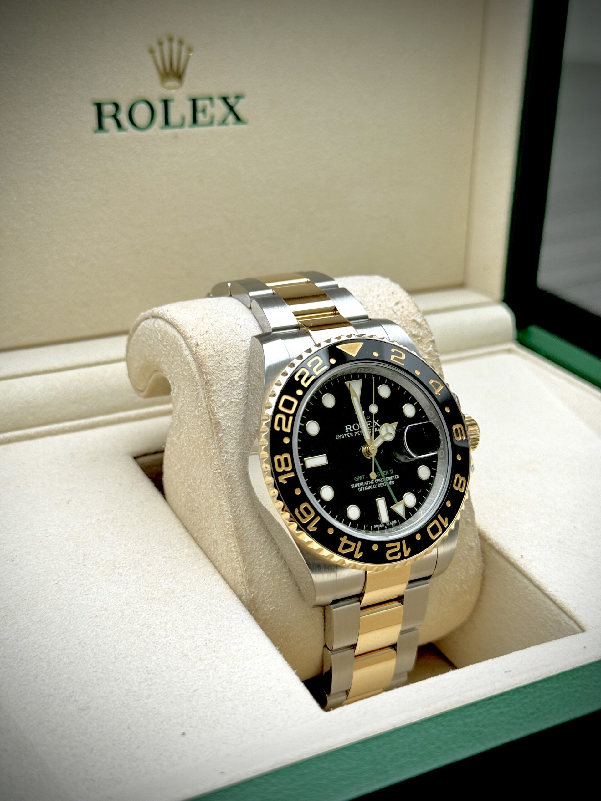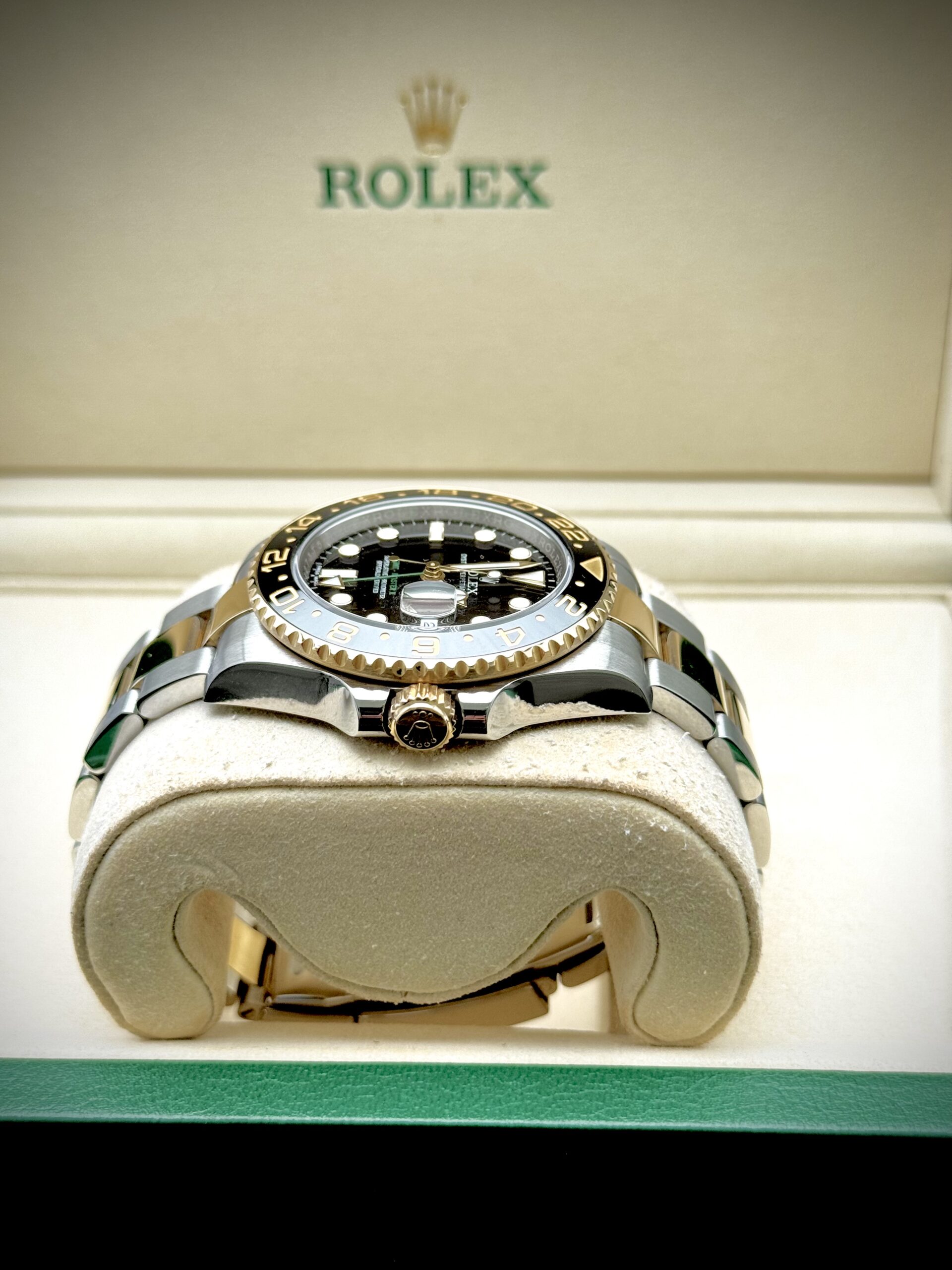 La Rolex GMT-Master II “Two-Tone”, aussi appelée Rolesor jaune, combine acier Oystersteel et or jaune 18 ct, offrant un équilibre parfait entre sportivité et élégance. Ce modèle emblématique, conçu pour les voyageurs, se distingue par son esthétique bicolore et sa lunette Cerachrom, ainsi que par son mouvement 3285 à haute performance. Polyvalente, robuste et immédiatement reconnaissable, c’est l’une des configurations les plus appréciées de la GMT-Master II moderne.