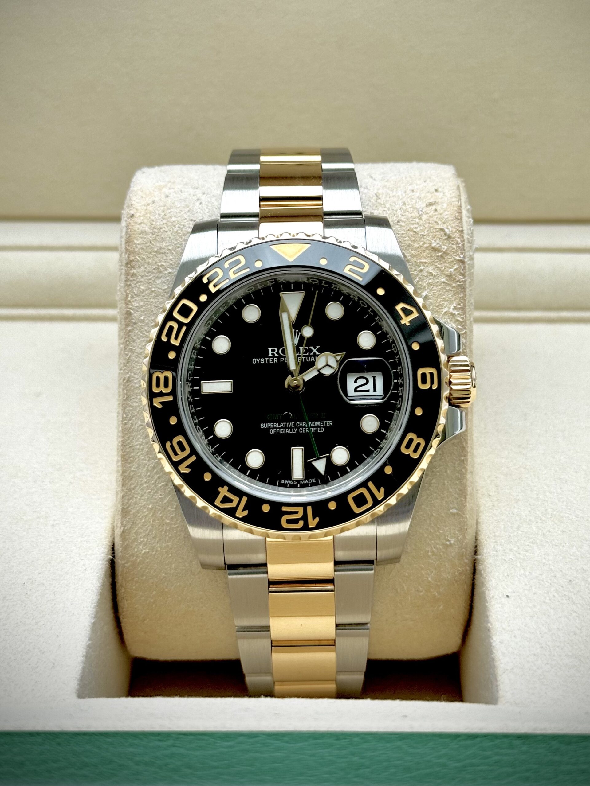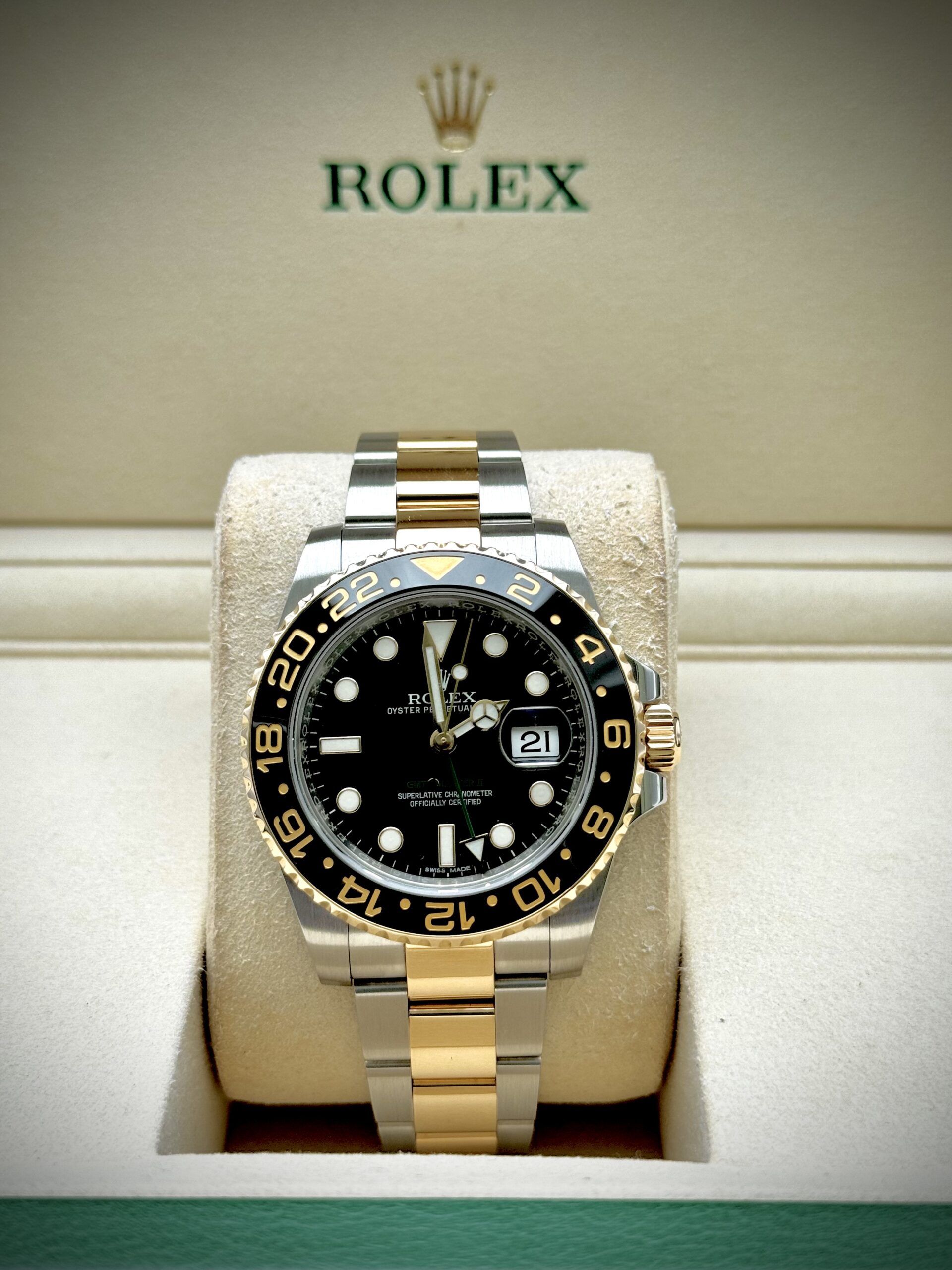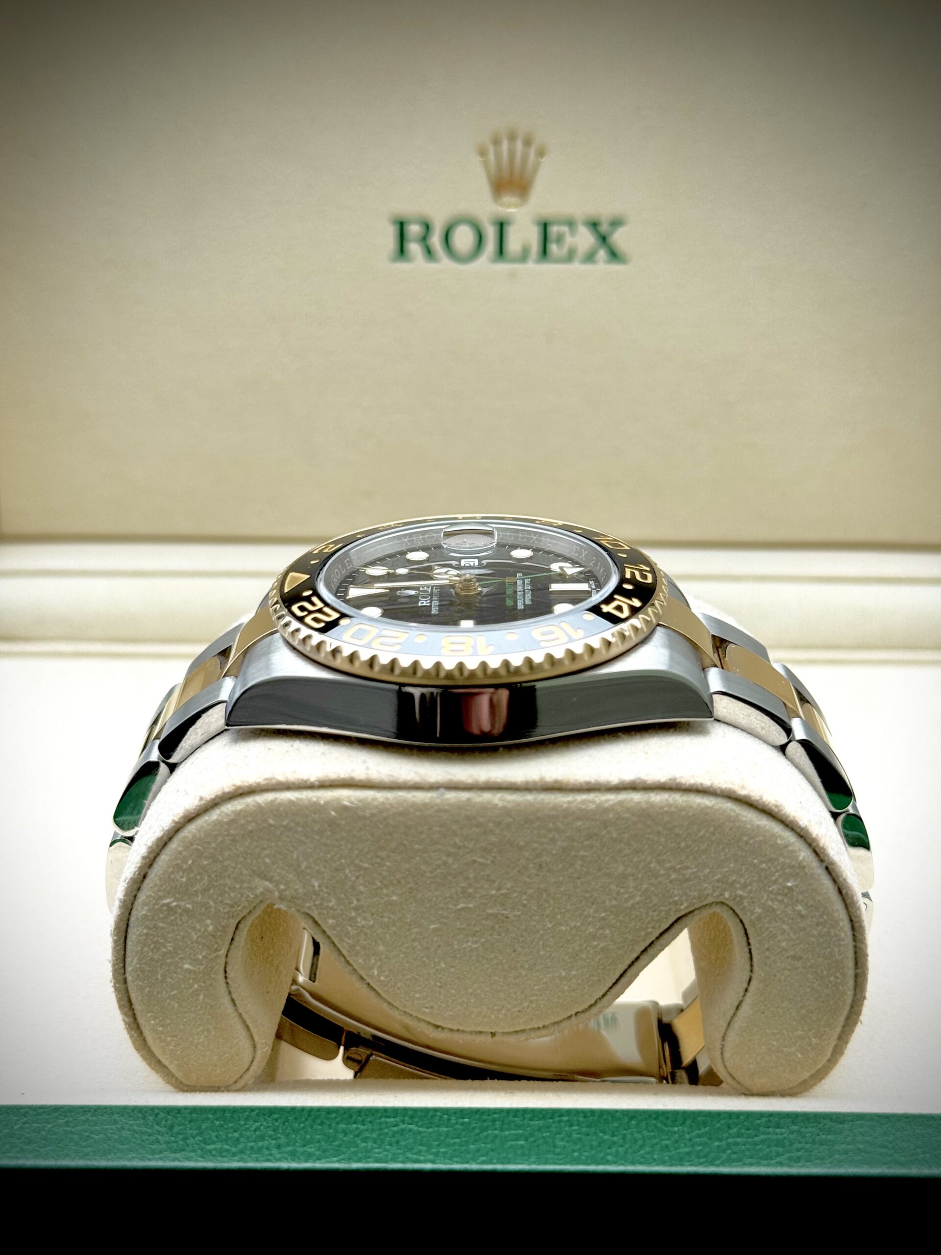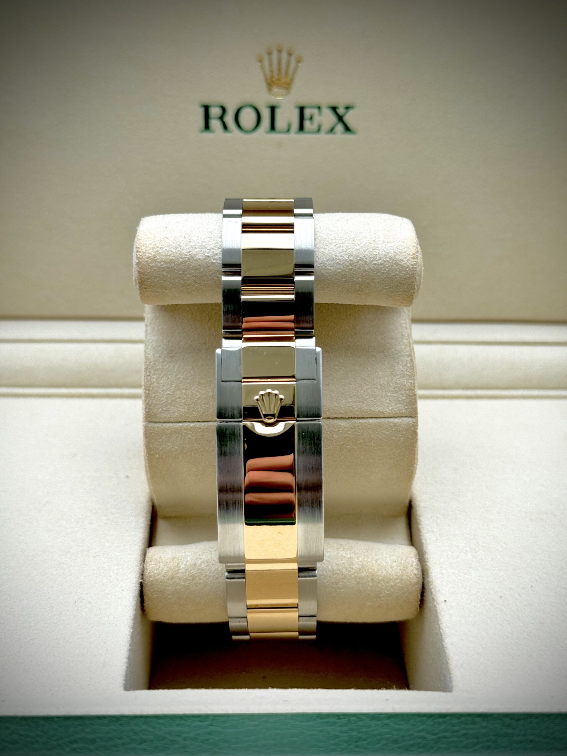 La Rolex GMT-Master II “Two-Tone”, aussi appelée Rolesor jaune, combine acier Oystersteel et or jaune 18 ct, offrant un équilibre parfait entre sportivité et élégance. Ce modèle emblématique, conçu pour les voyageurs, se distingue par son esthétique bicolore et sa lunette Cerachrom, ainsi que par son mouvement 3285 à haute performance. Polyvalente, robuste et immédiatement reconnaissable, c’est l’une des configurations les plus appréciées de la GMT-Master II moderne.