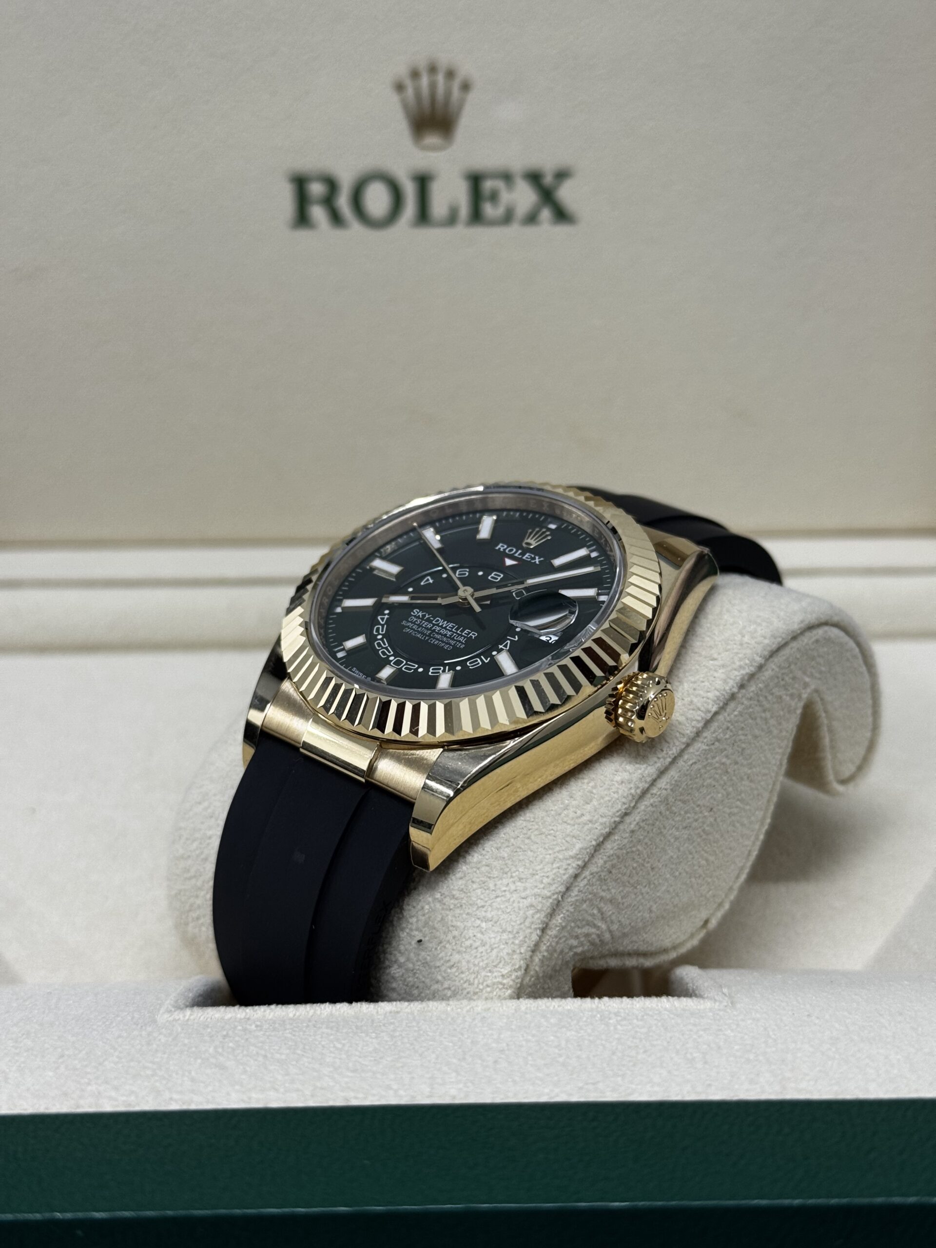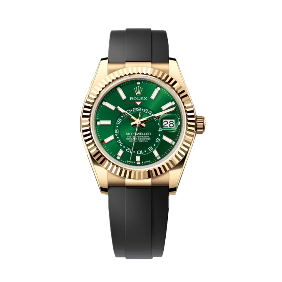 The Rolex Sky-Dweller Yellow Gold Green Dial is a masterpiece created for the modern traveler. Crafted in a 42 mm 18 ct yellow gold case, this prestigious timepiece combines refined aesthetics with remarkable technical sophistication. Its green sunray dial showcases Rolex’s unique dual time-zone display and Saros annual calendar — a hallmark of innovation and precision. Elegant, bold, and highly functional, the Sky-Dweller stands as a true symbol of contemporary watchmaking excellence.