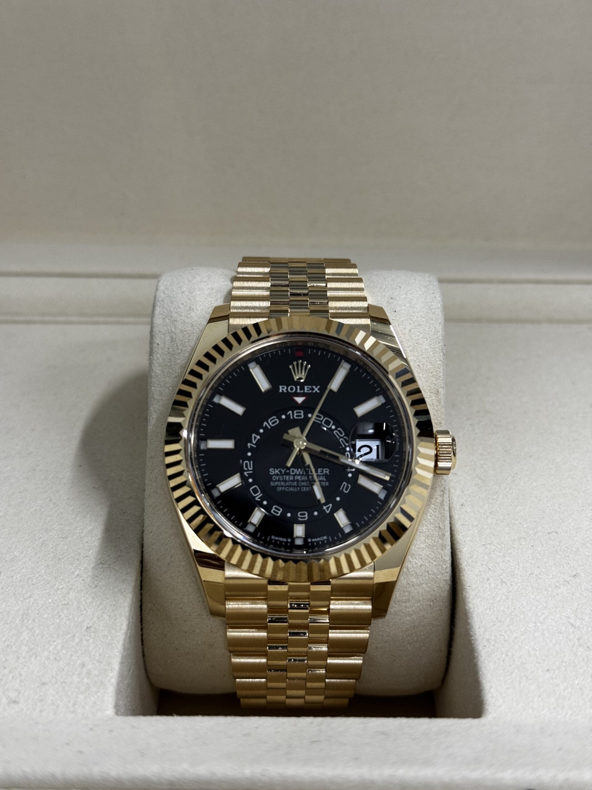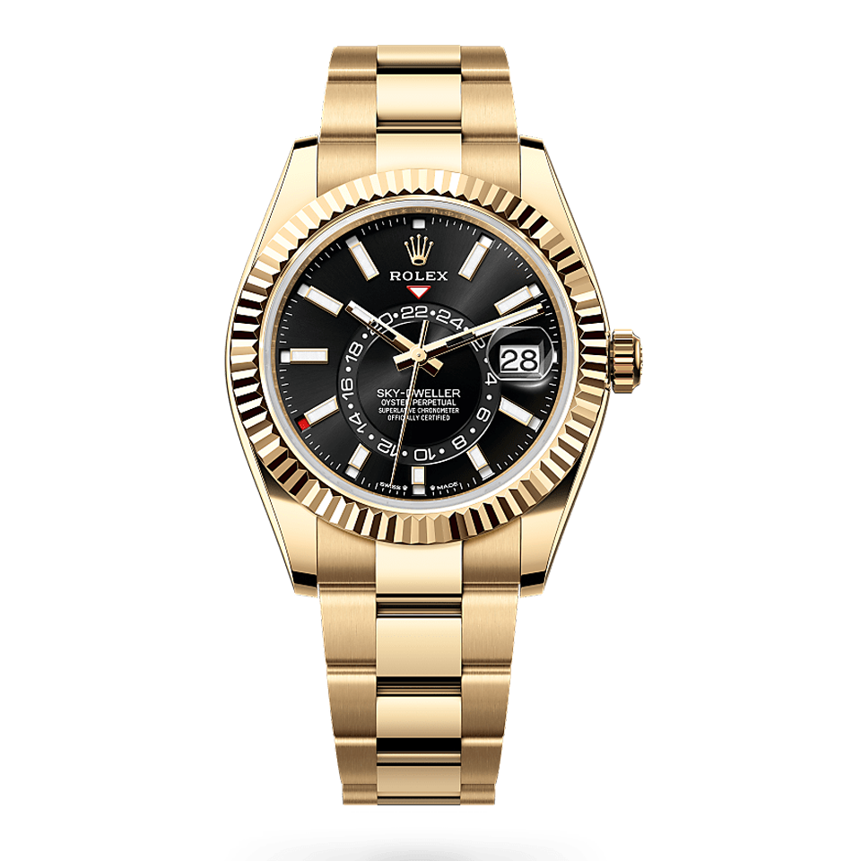 La Rolex Sky-Dweller Black Dial sur bracelet Jubilee est l’une des montres les plus sophistiquées de la collection Rolex, combinant design puissant et complications avancées. Destinée aux voyageurs, elle offre un double fuseau horaire intuitif ainsi qu’un calendrier annuel Saros d’une grande précision. Son cadran noir profond, associé à la lunette cannelée emblématique et au bracelet Jubilee, donne à cette pièce une allure élégante, moderne et hautement distinctive. À la fois technique et luxueuse, la Sky-Dweller demeure une référence incontournable en matière d’horlogerie contemporaine.